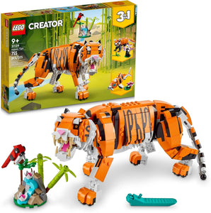 Passionate animal fans aged 9+ will love to play out fun stories with this brilliant LEGO Creator 3in1 Majestic Tiger (31129) building toy for kids. It features a brick-built tiger model with a posable tail, legs, body, shoulders, head and jaw, and it can also change its facial expressions. For endless play possibilities, at least 3 different build-and-play experiences are available to kids with this fantastic LEGO Creator 3in1 set. They can build the toy tiger with a red bird and rebuild it into a posable red toy panda with bamboo and a bonsai tree that can be turned into a toy koi fish with a moving tail, flippers, and water lilies. Or they can delve into their imaginations to create another animal! This 3in1 animal building toy for kids comes with interactive digital building instructions to make the building experience even more fun. Available in the free LEGO Building Instructions app for use on smartphones and tablets, the zoom and rotate tools help kids visualize the model as they build. This thrilling animal adventures LEGO Creator 3 in 1 set with its majestic tiger toy makes an inspiring kids' birthday present or any time treat. The tiger toy measures over 5 in. (14 cm) high, 12 in. (33 cm) long and 2 in. (7 cm) wide. Contains 755 pieces