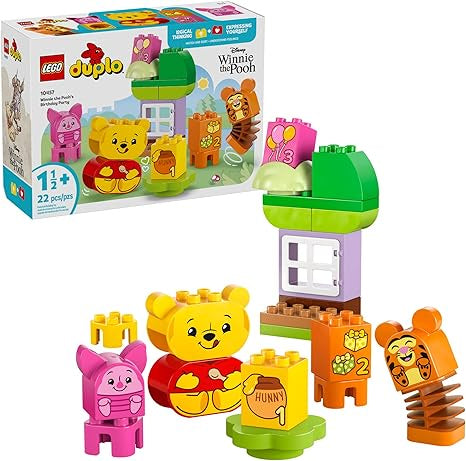 Introduce toddlers to learning through play with the LEGO DUPLO Disney Winnie the Pooh's Birthday Party toy (10457). This educational building set engages little ones 18 months and up with colorful party fun featuring beloved characters Winnie the Pooh, Tigger, and Piglet. Each DUPLO figure is specifically designed for little hands and features double-sided faces with different expressions, helping toddlers explore emotions and social skills through imaginative storytelling and party play scenarios. Young builders practice early development skills by matching colored gifts to characters and taking first steps in counting with numbered presents. This toddler learning toy supports social-emotional development for little Disney fans and makes a great gift for girls and boys 18 months+. Contains 22 pieces.